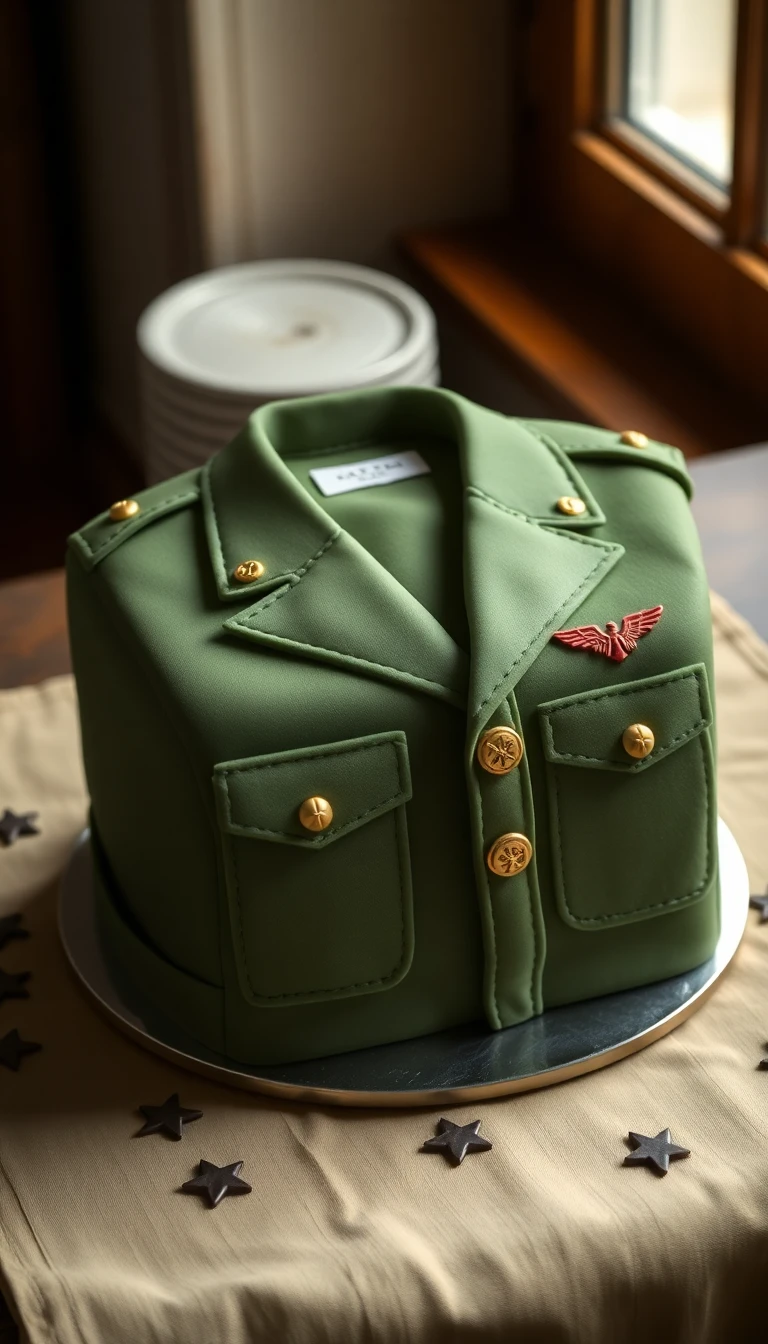 This cake is a cool tribute to the Scout Regiment from Attack on Titan! It looks just like a green uniform with shiny gold buttons and pockets. The red emblem adds a special touch, showing off the bravery of the characters. This cake is perfect for fans who love adventure and teamwork. It makes you think about all the exciting missions the Scouts go on to protect their world. Eating a cake like this would be like celebrating with your favorite heroes!