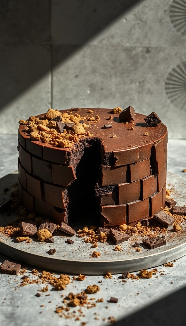The Fallen Wall Cake looks just like a strong fortress, inspired by the amazing world of Attack on Titans. Its layers are stacked high, resembling big stone walls. The dark chocolate makes it look rich and delicious. Crumbled cookies on top remind us of the dust and rubble after a battle. A piece is already taken out, showing the soft, tasty inside. This cake is perfect for any fan who loves adventure and treats!