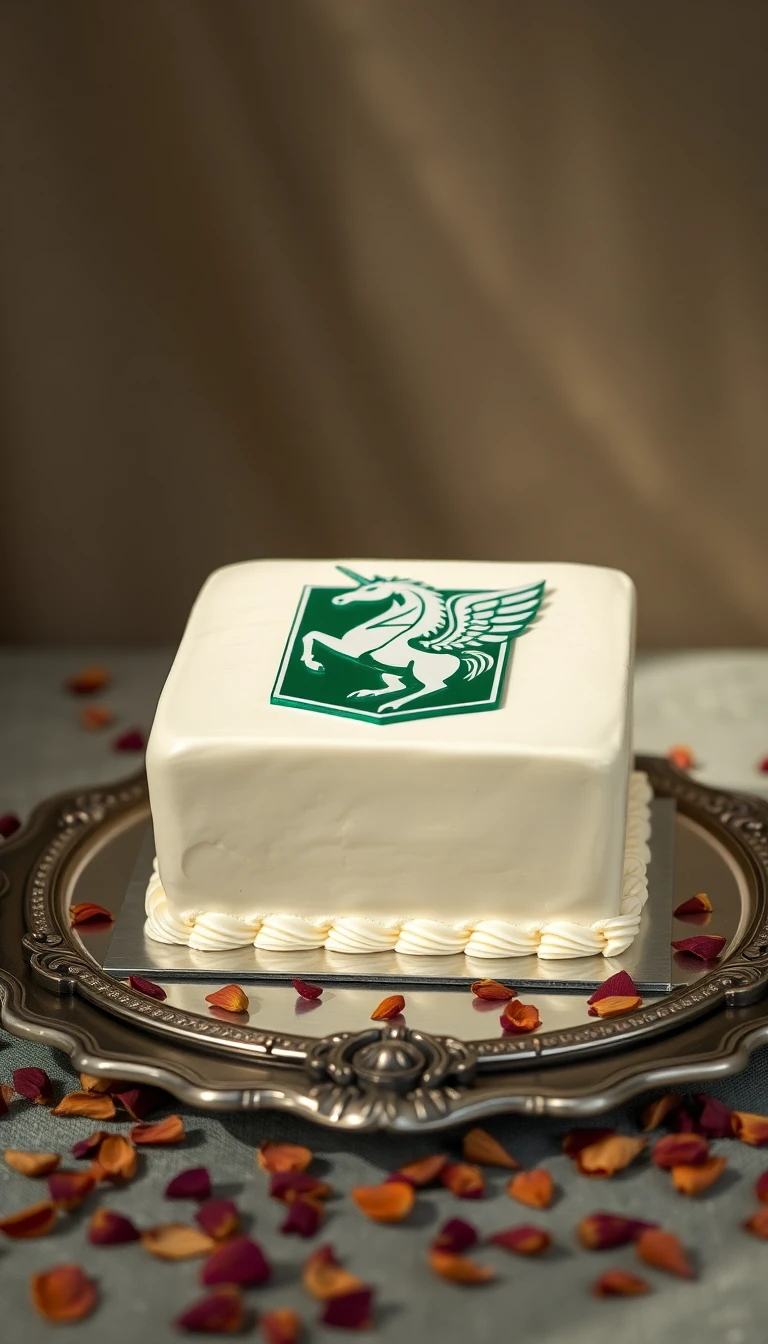 This special cake is inspired by the brave soldiers in “Attack on Titan.” It looks like a strong fortress with a cool unicorn logo on top. The unicorn is a symbol of hope and courage. The cake is white and smooth, like fresh snow. Around it, colorful flower petals add a pop of color. This cake would be perfect for a party celebrating heroes and adventures. Just like the characters in the show, this cake shows that even in tough times, we can find something magical!