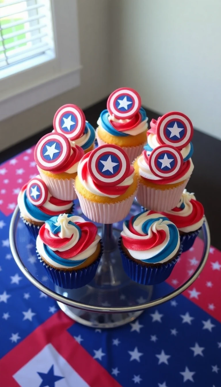 Look at these fun cupcakes! They are dressed in red, white, and blue, just like the colors of a flag. Each cupcake has swirls of frosting that are bright and cheerful. On top, there are cool decorations that look like a superhero’s shield! These treats would be perfect for a party or a special celebration. They make everything feel festive and exciting. Who wouldn’t want to eat one of these yummy cupcakes?