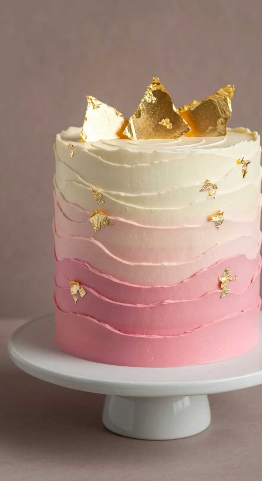 You know what’s amazing? This Blush Pink Ombre cake with golden leaf accents! The way the soft pinks blend into each other creates a dreamy, gentle look that’s just perfect for any celebration. Each layer is wrapped in smooth, swirled frosting that invites you to take a closer look. The golden leaves add a touch of elegance, making it stand out like a shiny treasure. This cake doesn’t just look good; it can also be made in flavors like vanilla or strawberry, which means it tastes as delightful as it appears! Imagine serving this beauty at a birthday or a wedding—it’ll surely be a showstopper! I remember my friend made a similar cake for her baby shower, and everyone was in awe of how beautiful it was. It truly made the day feel extra special!