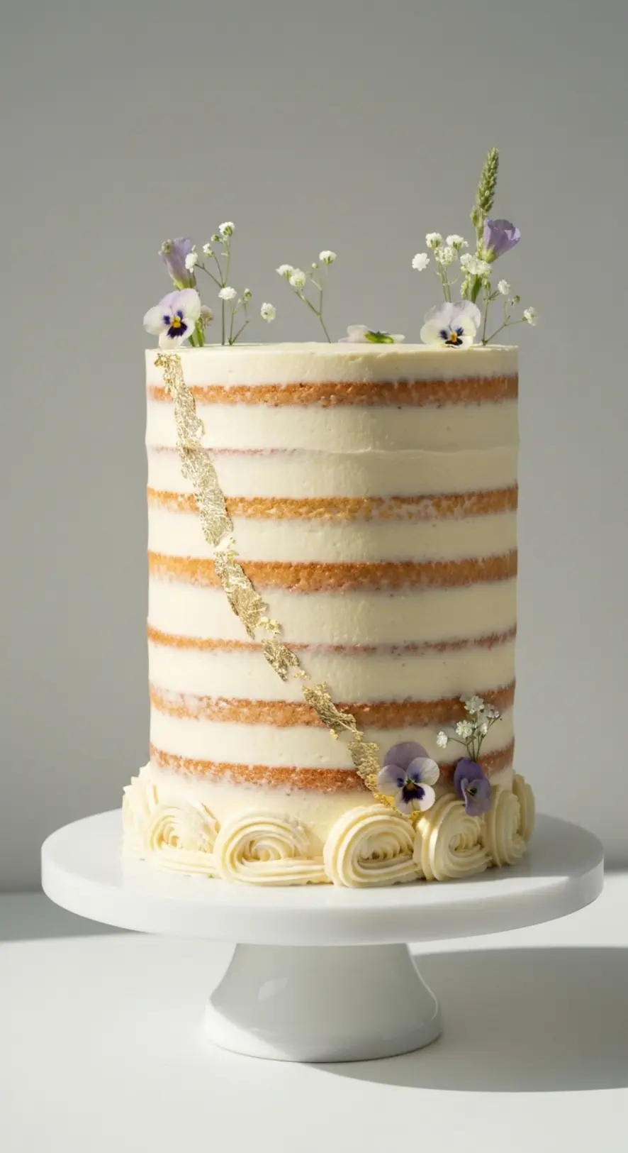 You know what’s amazing? This cake with ivory buttercream and sparkling edible gold leaf! It has a beautiful striped design that makes it look like a work of art. The delicate flowers and greens on top add a lovely touch, making it perfect for special occasions like weddings or birthdays. The creamy frosting is smooth and dreamy, while the cake layers are just the right amount of fluffy. I remember the first time I saw a cake like this at a friend’s party; it took my breath away! This elegant treat is sure to impress everyone at your next celebration.