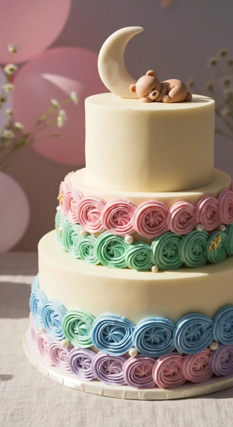 Close your eyes and imagine a delightful cake that looks like a soft pastel sunset! The Pastel Rosette Dream Cake has three fluffy layers, each dressed in dreamy swirls of pink, green, and blue frosting. Topped with an adorable sleeping bear and a crescent moon, this cake is not just a treat for your taste buds but a feast for your eyes too! As you slice into it, the sweet vanilla flavor mingles with a light, creamy texture, sending you back to the carefree days of childhood celebrations. Want a fun tip? Try adding a hint of lemon zest to the frosting for a surprise zing! It’ll make your cake extra special!
